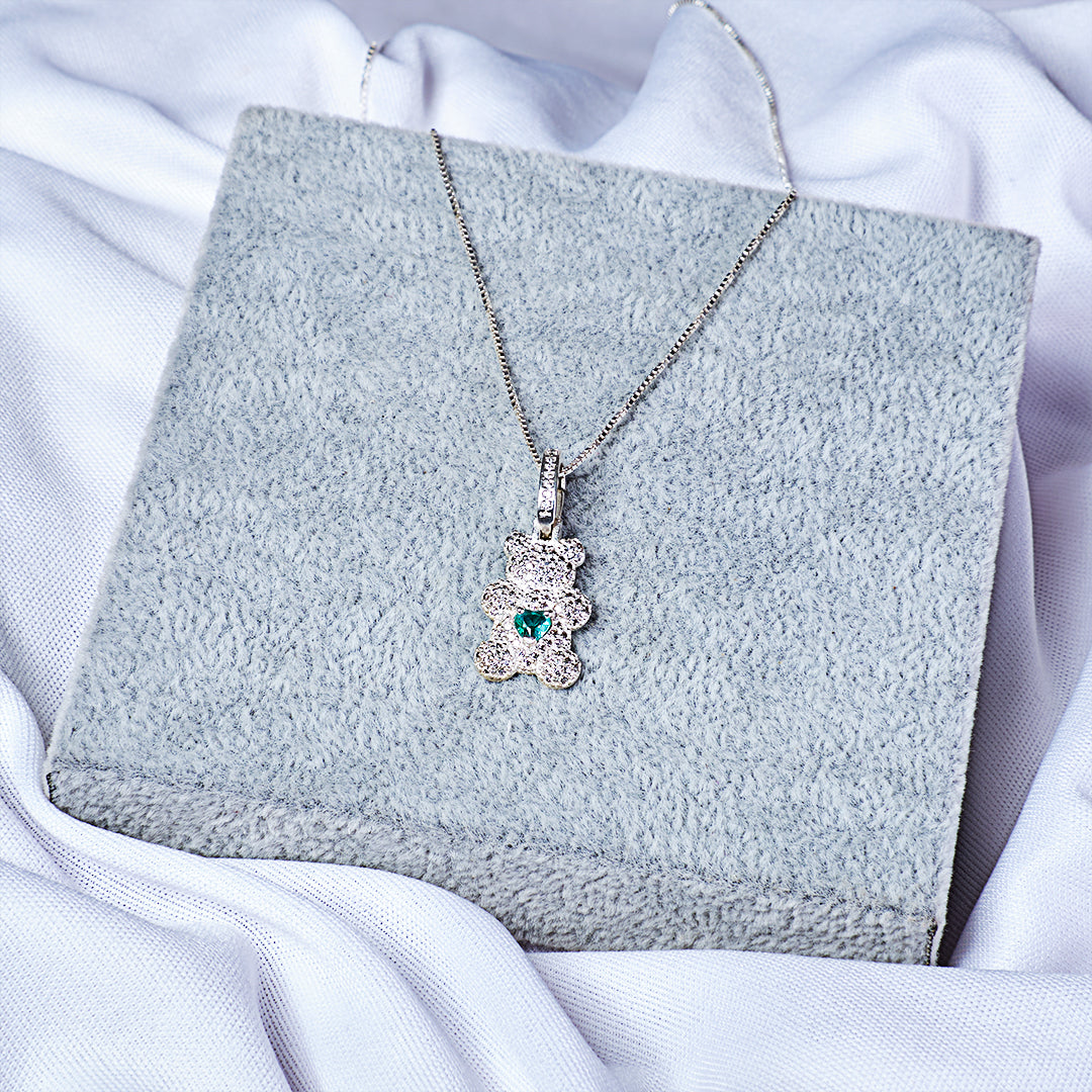 🐻 Design Encantador: Pingente de urso cravejado com zircônias e ponto de luz verde no centro.